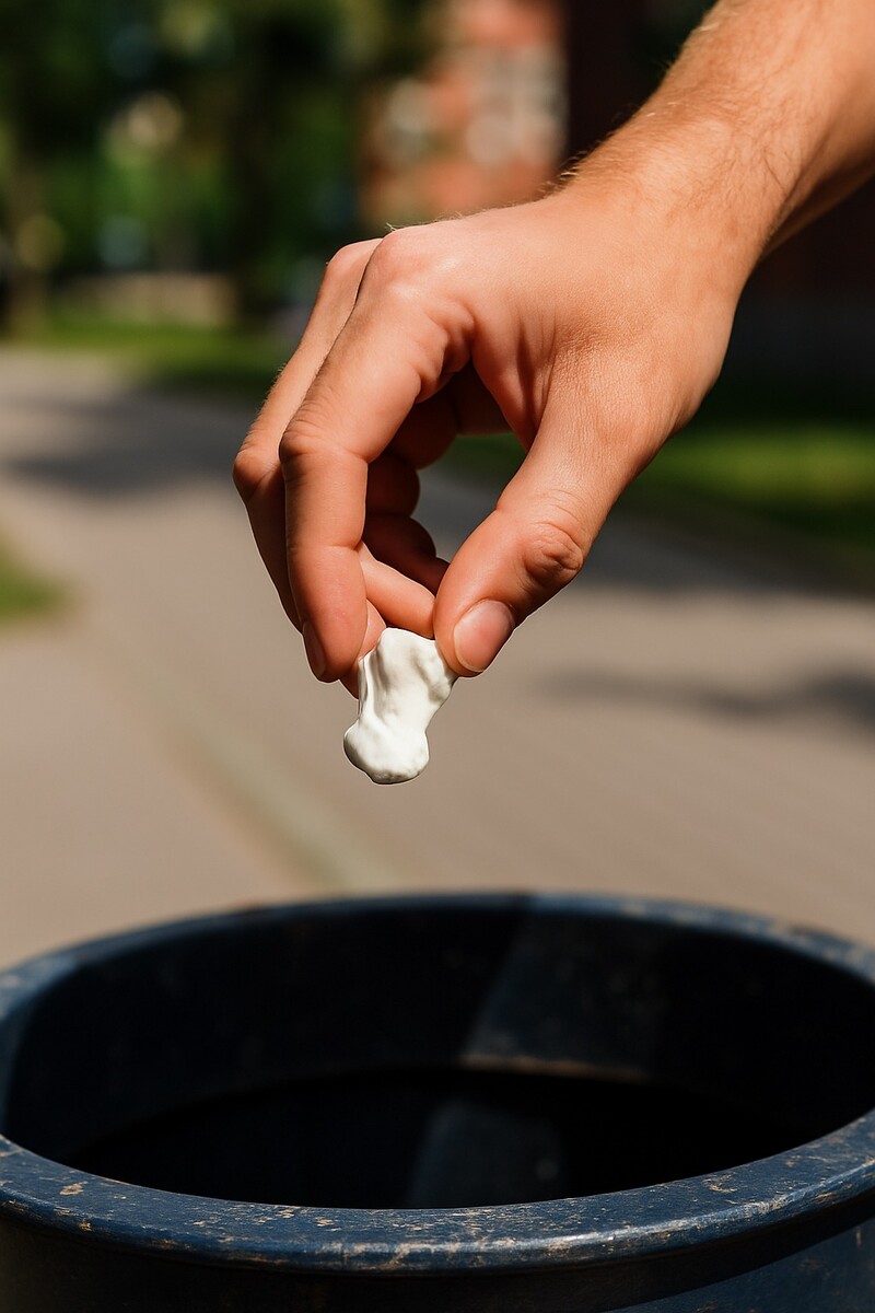 D’une part, on ne le mange pas (heureusement), donc une fois l’arôme dissipé, beaucoup de gens le jettent. Et soyons honnêtes : bien souvent, le chewing-gum finit collé sous une table ou craché dans la rue 😖. Étant du plastique, il n’est pas biodégradable : un chewing-gum jeté par terre peut mettre des années, voire des décennies à se dégrader, tout en se fragmentant en microplastiques. C’est un déchet urbain très répandu (regardez les trottoirs noircis de tâches rondes, surtout en été, ce sont des centaines de gommes collées). Chaque année, on produit plus de 2,4 millions de tonnes de chewing-gum dans le monde, une bonne partie finit dans la nature ou incinérée. Pour un objet censé n’être qu’éphémère, l’héritage environnemental est lourd : pollution visuelle (la fameuse gomme fossilisé sur le béton), nettoyage coûteux pour les municipalités, et ajout de plastique inutile dans l’environnement.